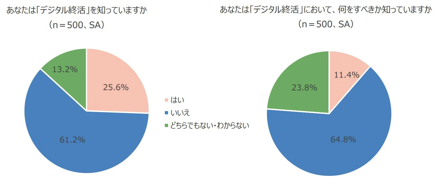 経営者と経営者の妻各250名に、「デジタル終活」を知っているか聞いたところ、「はい」と回答したのは全体で25.6%でした。