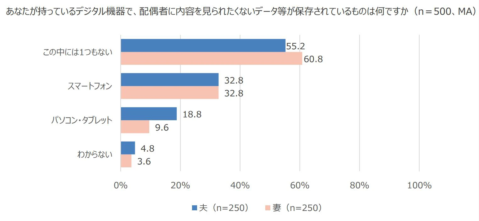 その一方で、配偶者に見られたくないデータ等を保存しているデジタル機器を「スマートフォン」と回答したのは夫、妻とも32.8%でした。