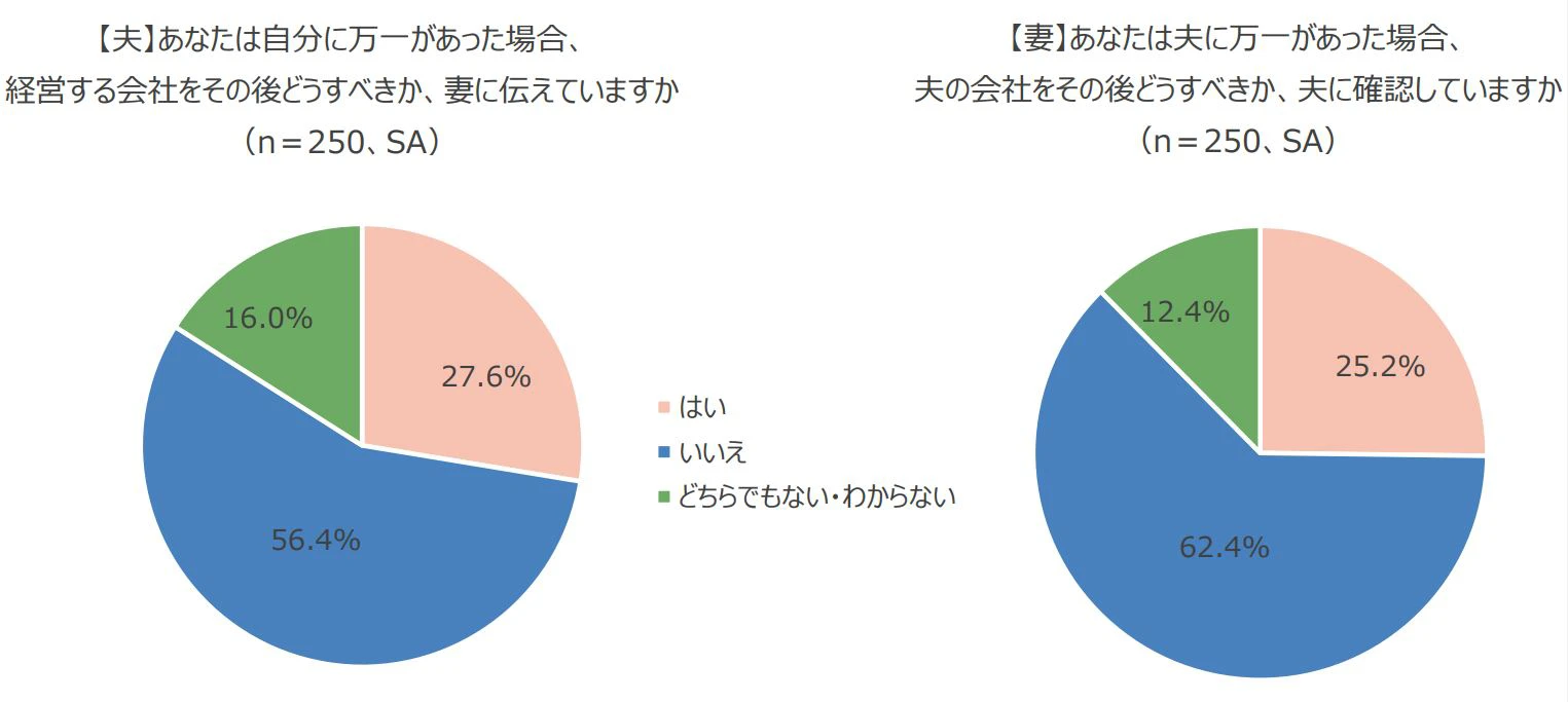 また、経営者の妻250名に、夫に万一があった場合、夫の会社をその後どうすべきか、夫に確認しているか聞いたところ、「はい」と回答したのは25.2%でした。