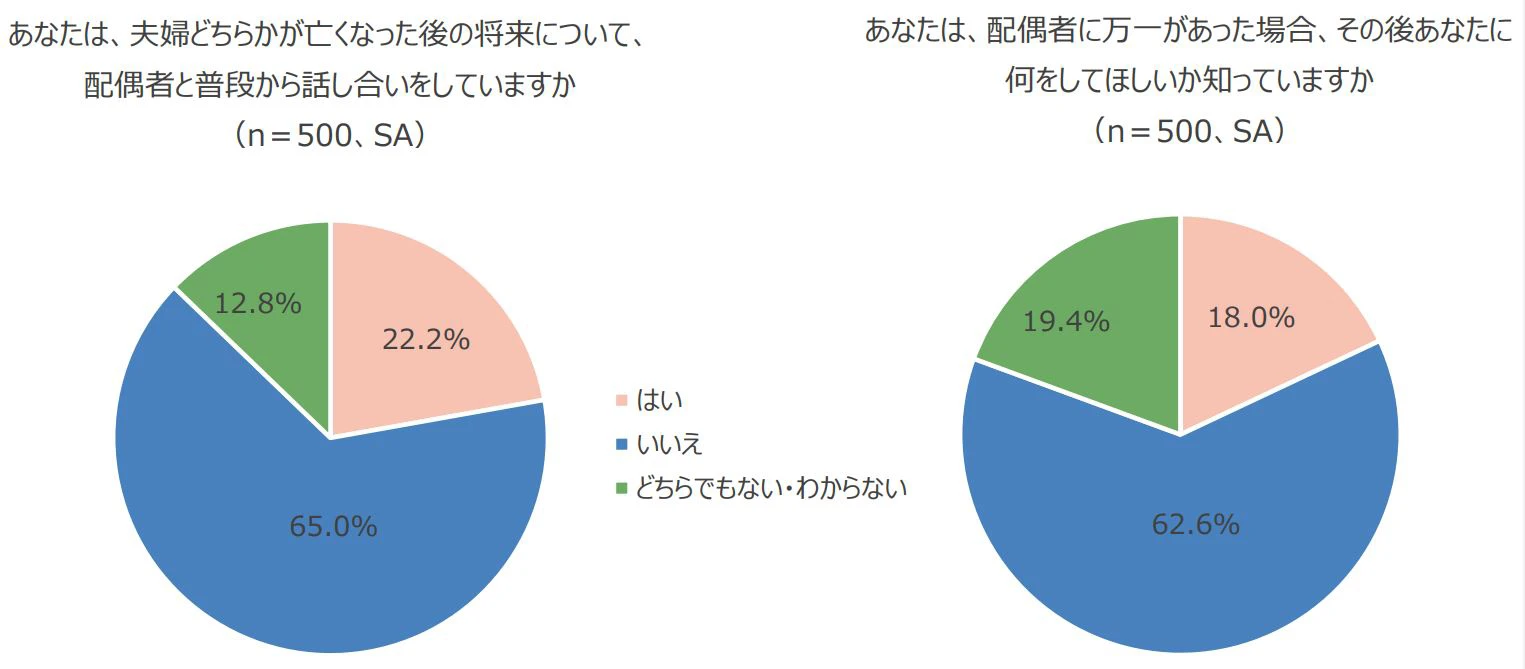 夫婦どちらかが亡くなった後の将来について、配偶者と普段から話し合いをしている人の方が、そうでない人よりも配偶者に万一があった場合、その後何をしてほしいか知っていると回答した割合が圧倒的に多いことも分かりました。