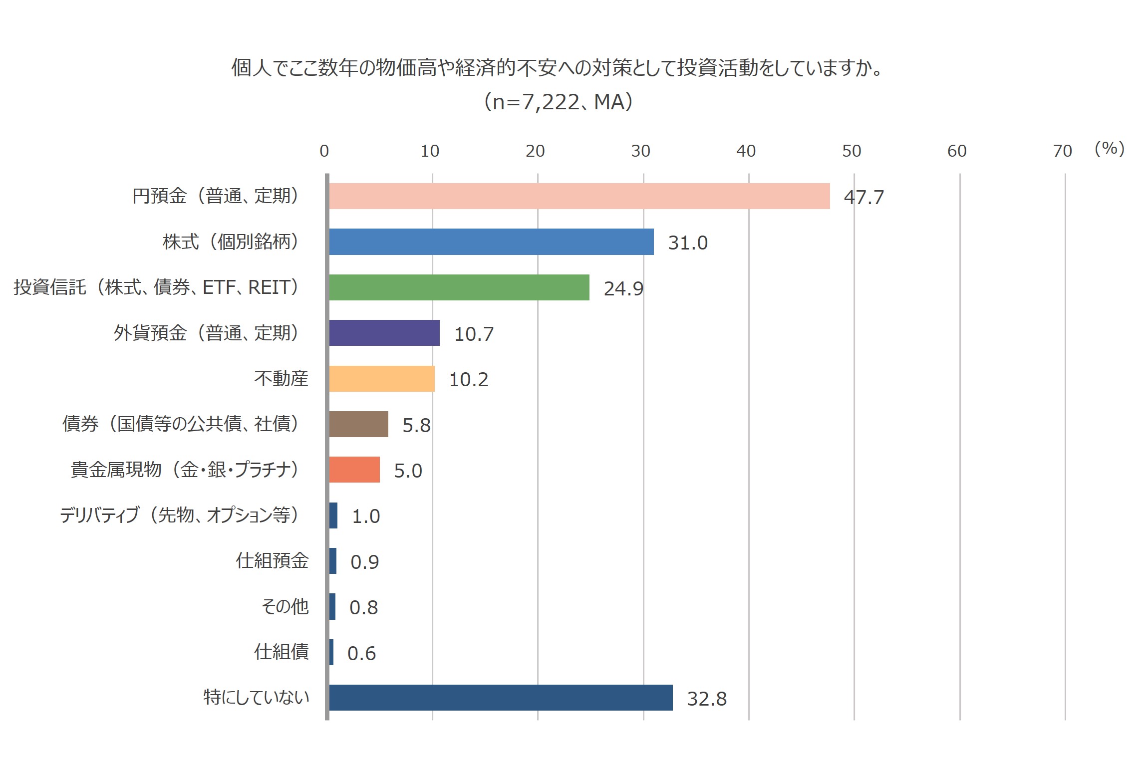 中小企業経営者7,222名に、ここ数年の物価高や経済的不安への対策として投資活動をしているか聞いたところ、個人では「円預金(普通、定期)」が47.7%、「株式(個別銘柄)」が31.0%、「投資信託(株式、債券、ETF、REIT)」が24.9%となり、「特にしていない」は32.8%でした。