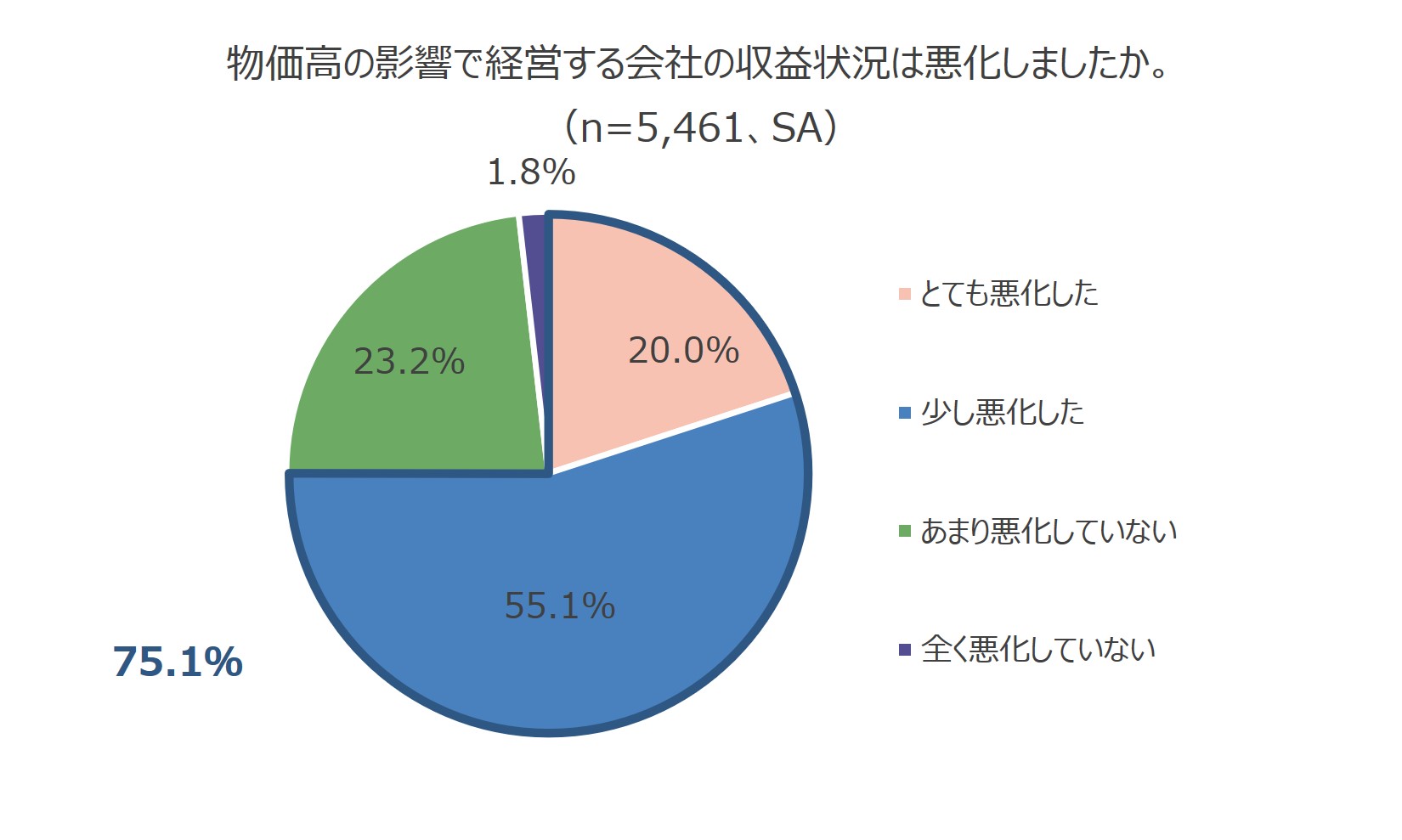 また、経営する会社で物価高の「影響がある」と回答した5,461名を対象に、物価高の影響で経営する会社の収益状況は悪化したか聞いたところ、「とても悪化した」との回答は20.0%、「少し悪化した」は55.1%となり、「悪化した」と回答した人は合計で7割超(75.1%)でした。