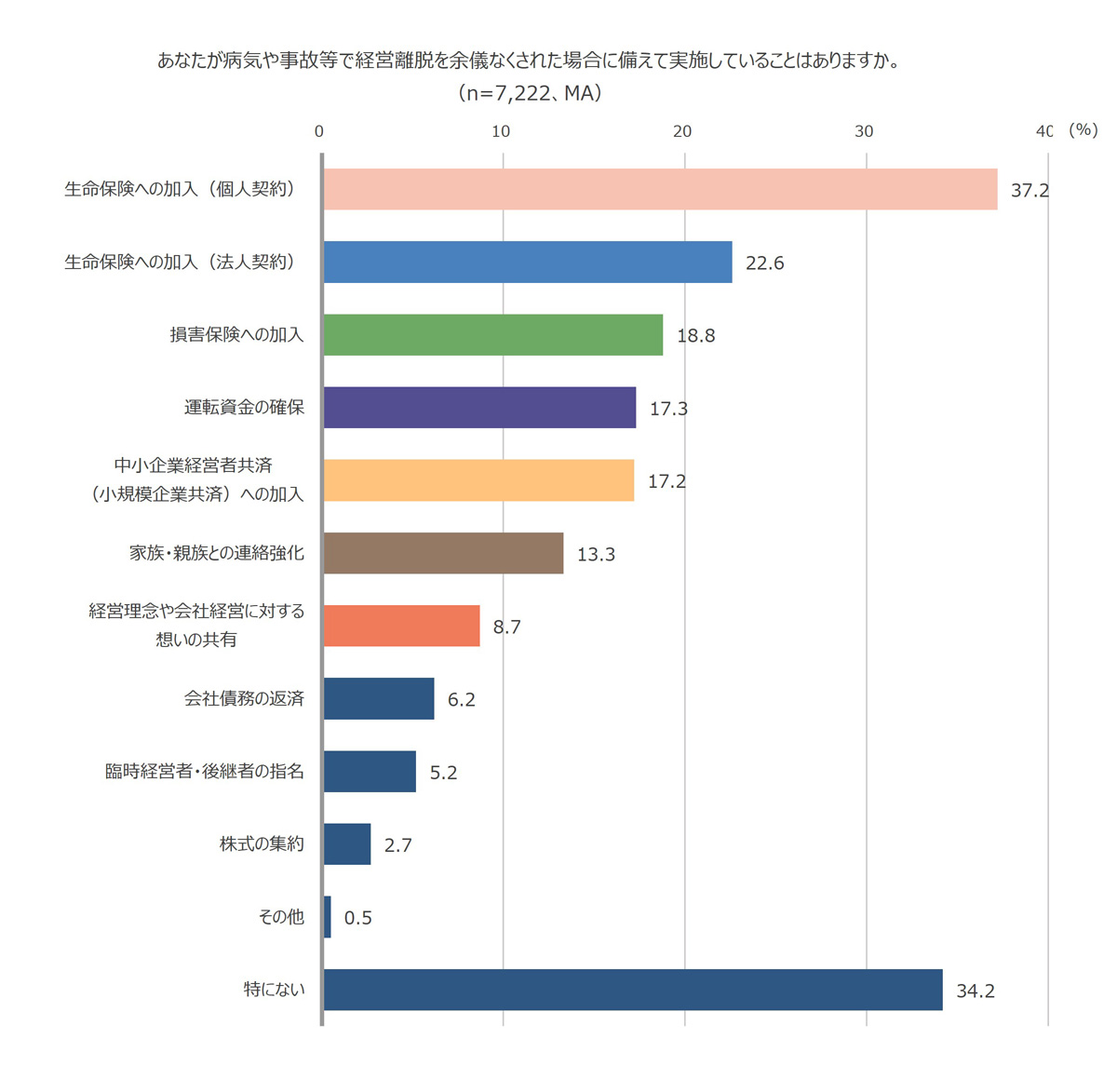 中小企業経営者7,222名に、病気や事故等で経営離脱を余儀なくされた場合に備えて実施していることはあるか聞いたところ、「生命保険への加入(個人契約)」が37.2%、「生命保険への加入(法人契約)」が22.6%、「損害保険への加入」が18.8%となり、「特にない」は34.2%でした。