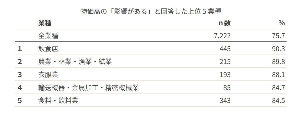 また、物価高の「影響がある」という回答を業種別に見ると、「飲食店」(90.3%)が最も高く、次いで「農業・林業・漁業・鉱業」(89.8%)、「衣服業」(88.1%)となりました。