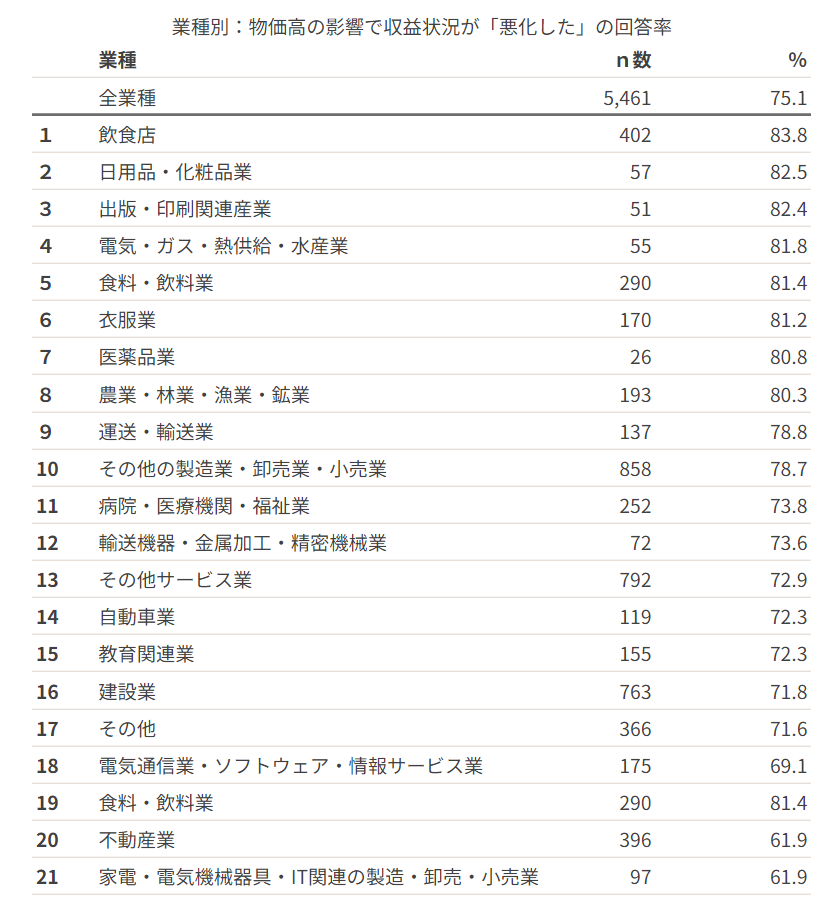 物価高の影響で収益状況が「悪化した」という回答を業種別に見ると、「飲食店」(83.8%)が最も高く、次いで「日用品・化粧品業」(82.5%)、「出版・印刷関連産業」(82.4%)となりました。