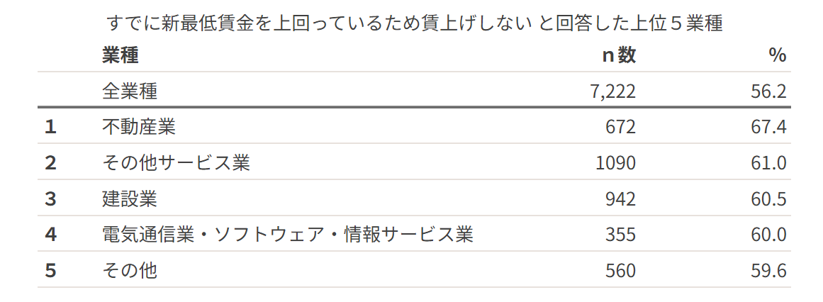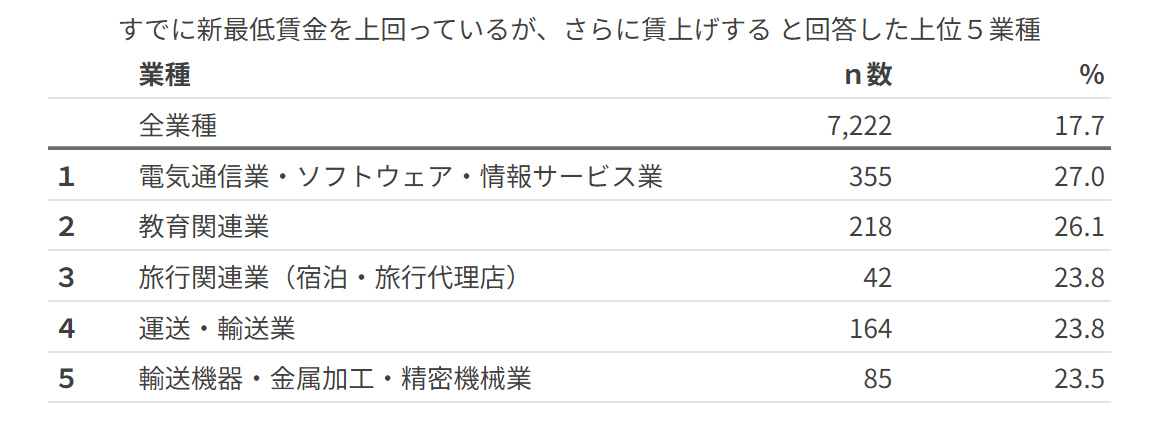 各項目の回答率を業種別に見ると、「すでに新最低賃金を上回っているため変更しない」は「不動産業」(67.4%)、「すでに新最低賃金を上回っているが、さらに引き上げる」は「電気通信業・ソフトウェア・情報サービス業」(27.0%)が最も高い結果となりました。
