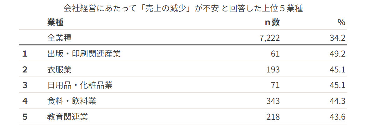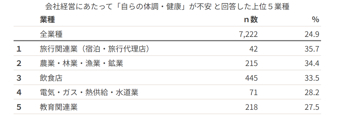 各項目の回答率を業種別に見ると、「売上の減少」は「出版・印刷関連産業」(49.2%)、「人材の確保・定着」は「運送・輸送業」(48.8%)、「自らの体調・健康」は「旅行関連業(宿泊・旅行代理店)」(35.7%)が最も高い結果となりました。