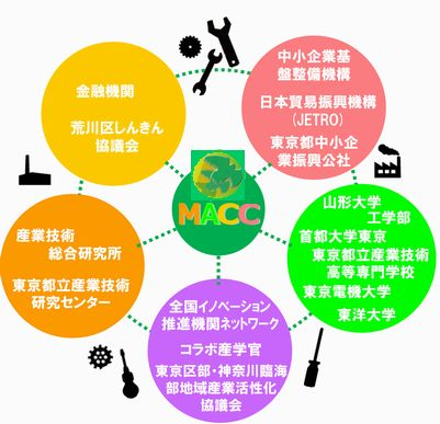 そんな時、荒川区が荒川区長の旗振りでものづくり企業の産学連携を支援し始めた。それが「MACCM(まっく)プロジェクト」だ。Monozukuri Arakawa City Clusterの頭文字を取った。「産・学・金・公」のあらゆる資源を横断的・領域的にカバーし、経営・技術両面からのサポート体制の構築を目指すものだ。
