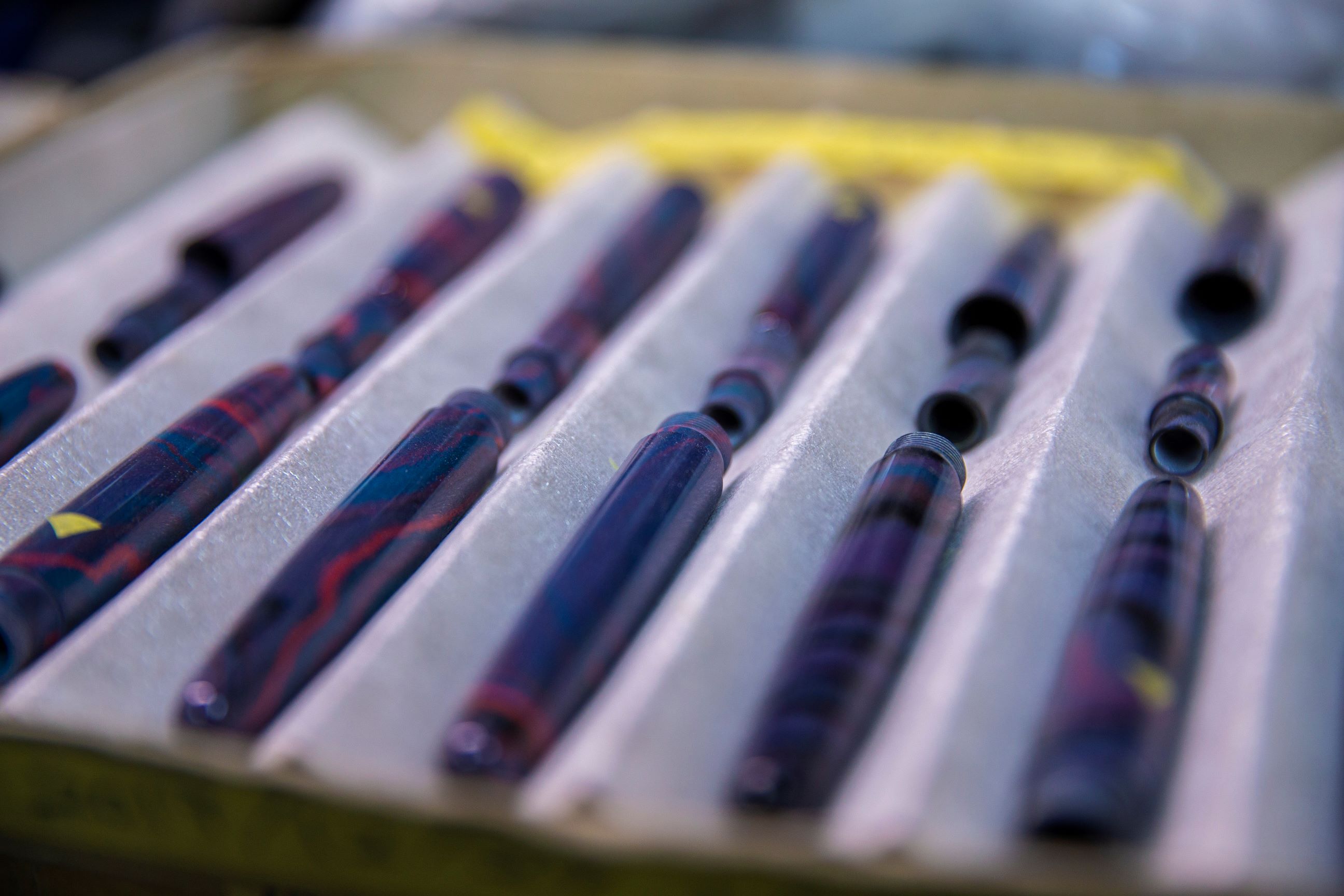 「エボナイトはもともと黒色で、顔料を混ぜすぎると単色になってしまうし、あまり混ぜないと大柄になってしまう。製品化してからも試行錯誤を繰り返して、やっとこの1、 2年で安定した模様ができるようになりました」