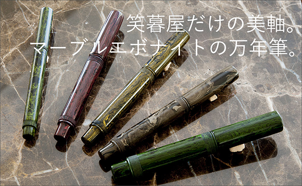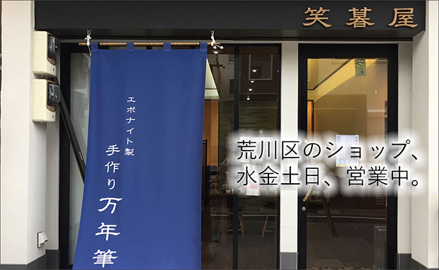 現在、販売は、ウェブサイトでの直販と、路面店「笑暮屋(えぼや)」店頭での販売のみだ。敢えて文房具屋などに卸してはいない。エボナイトは日焼けする特徴があるので、品質を保証するために流通網には乗せないとのこだわりからだ。今や、万年筆の売り上げは会社全体の2割を占めるまでになっているというから、まさにヒット商品と言えよう。